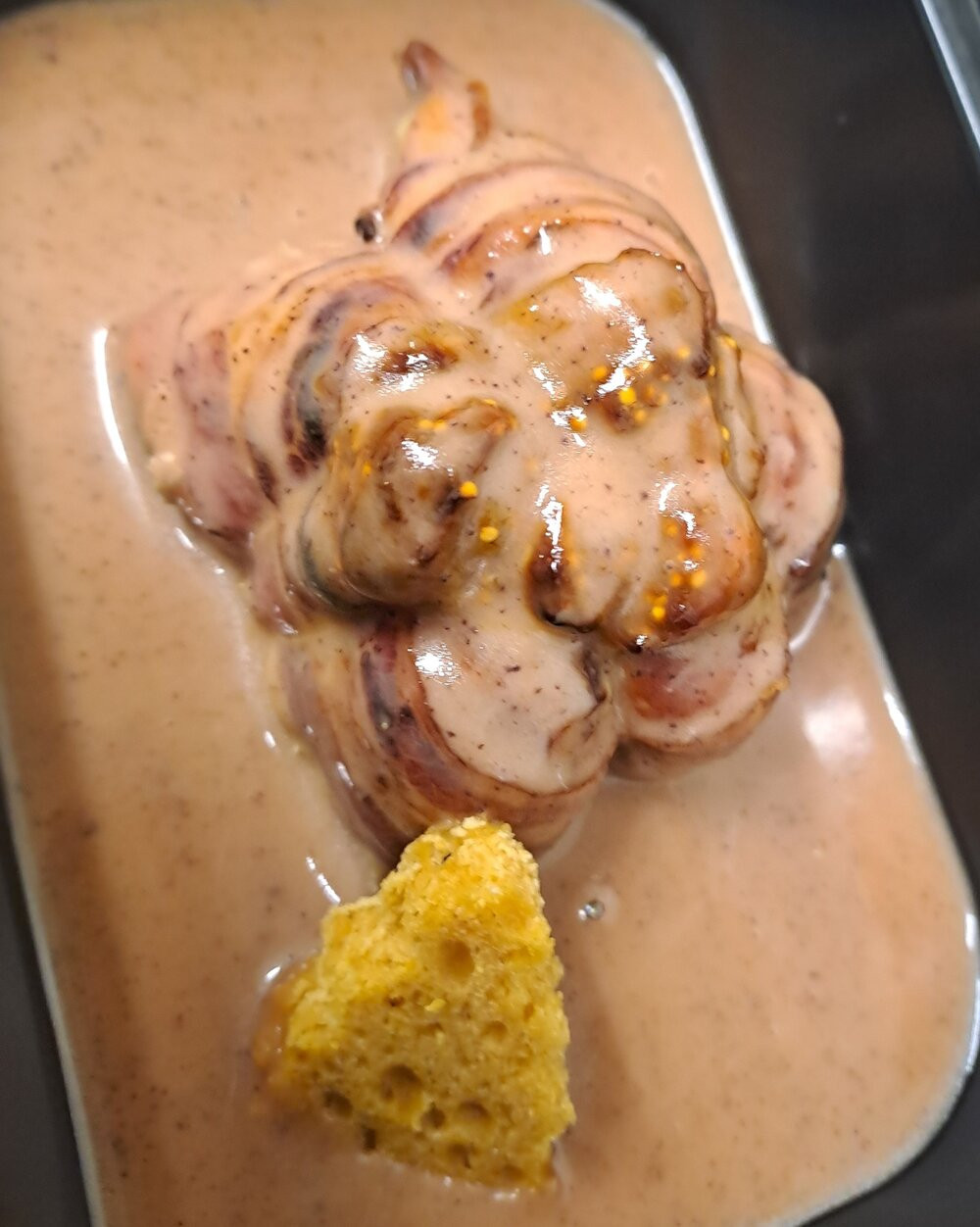 Ingrédients : cuisse de pintade, chair de volaille, foie gras de canard, figues, bouillon de volaille, crème fraiche, porto rouge, pain d'épices, sel poivre
