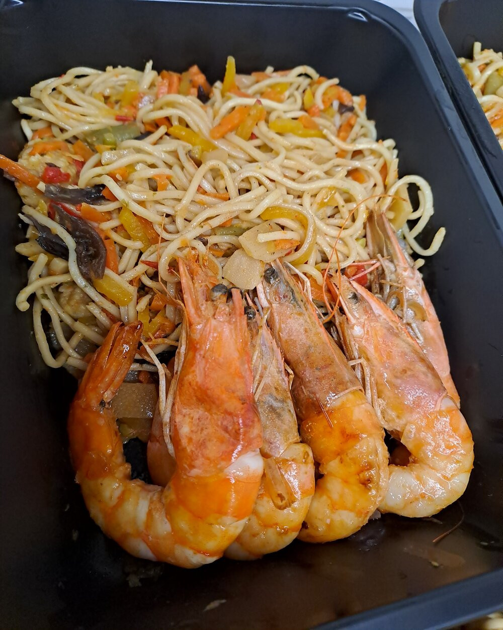 Ingrédients : Gambas, huile d'olive, NOUILLES (GLUTEN), sauce soja, carottes, carottes jaunes, haricots verts, pousses de bambou, jeune maïs, poivron rouge, oignon, huile de tournesol et colza, sel, épices, eau, SOJA, sucre, BLE, champignons noirs, gingembre, fécule de pomme de terre