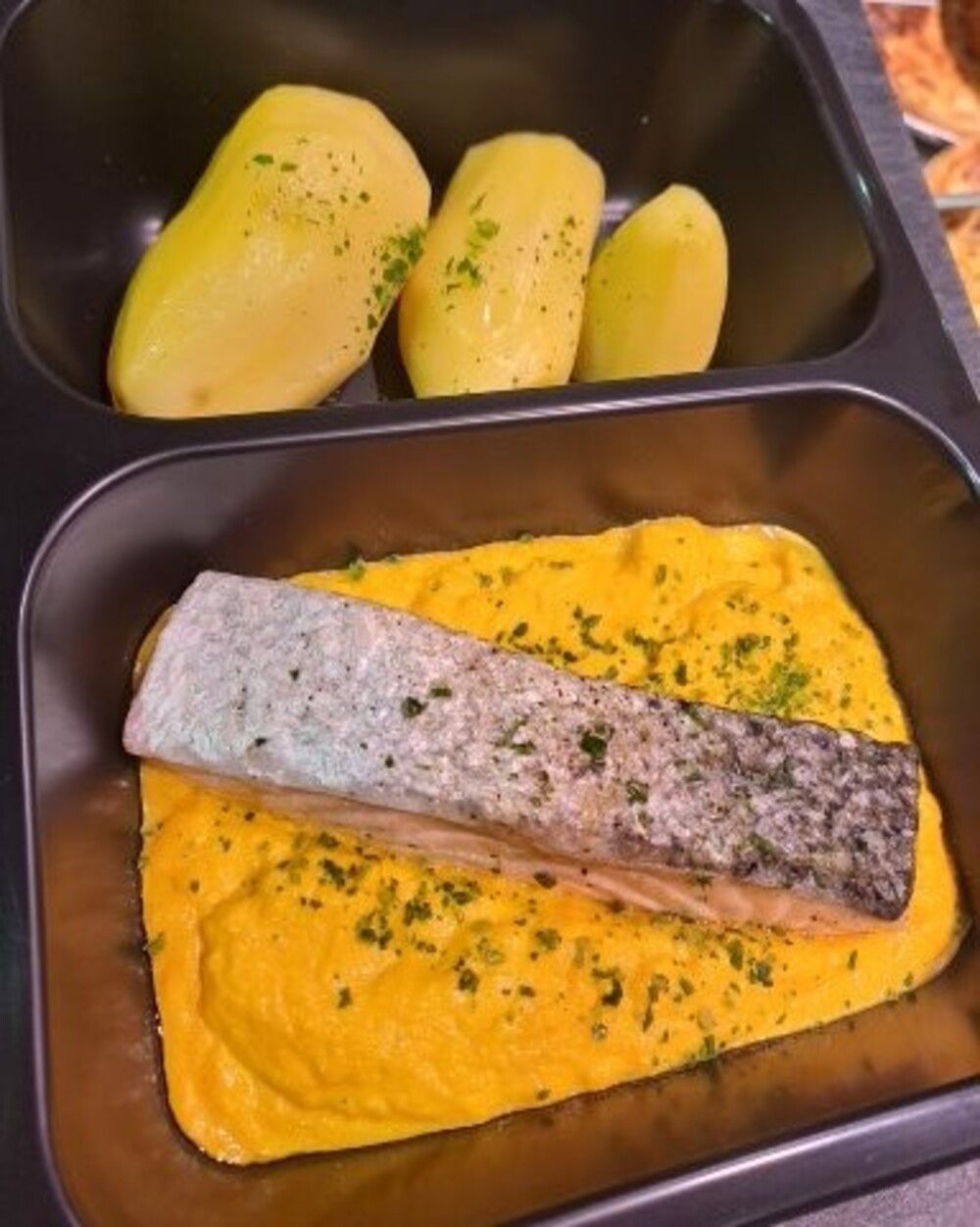 SAUMON ROSE, carottes, pomme de terre, cumin, sel poivre huile d'olive, beurre(LACTOSE)